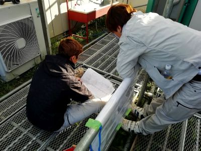 外の休憩スペース近くでベテランの先輩に図面の見方を教わる2年生です。
