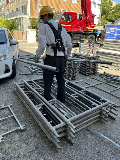 ちょっとだけ、足場用資材の建枠(約15㎏)を持ってみます。