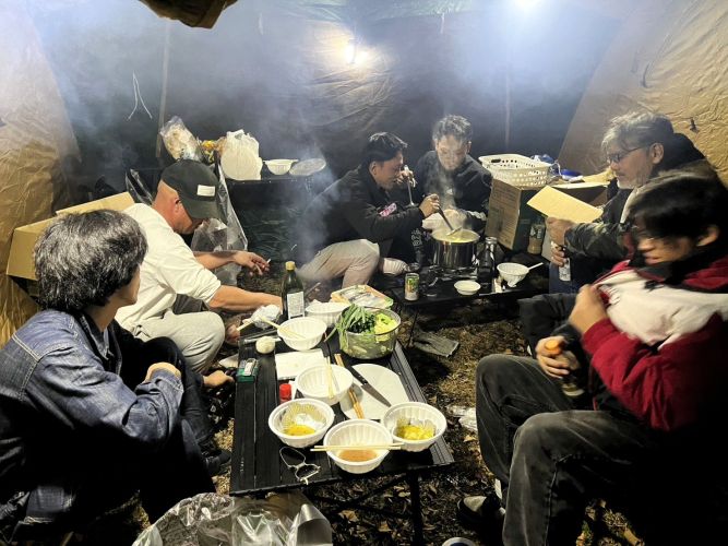 現場事務所のエアコンに頼るまではいかずとも、上着に袖を落としゆったり防寒の構え。