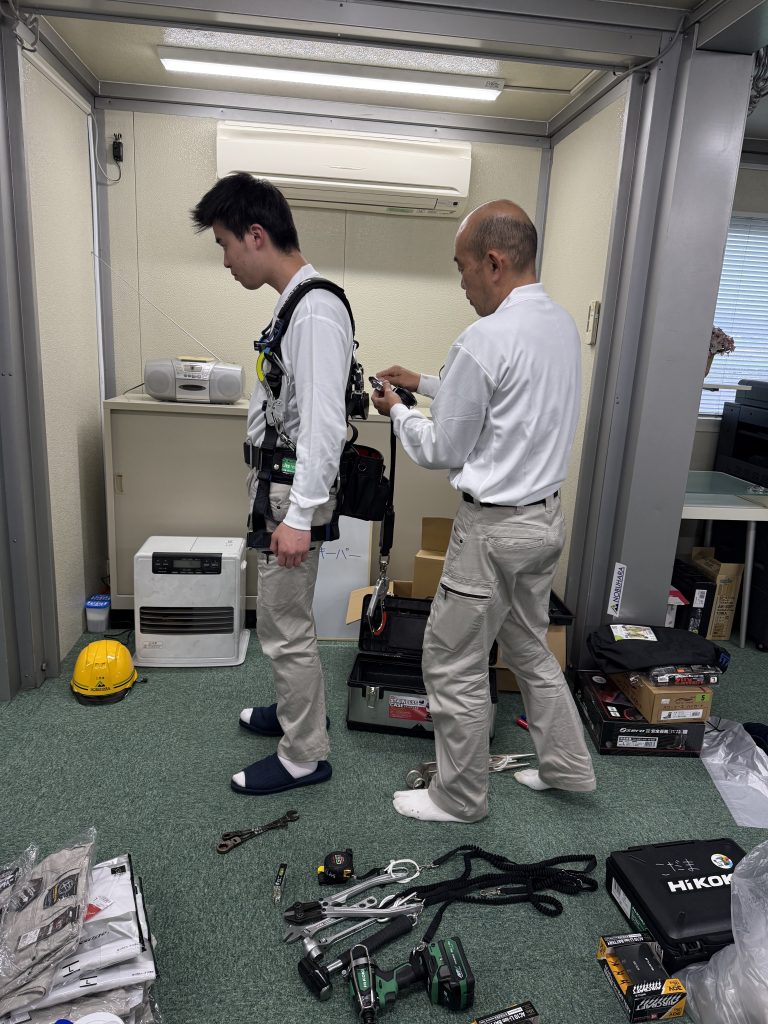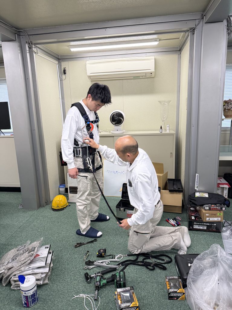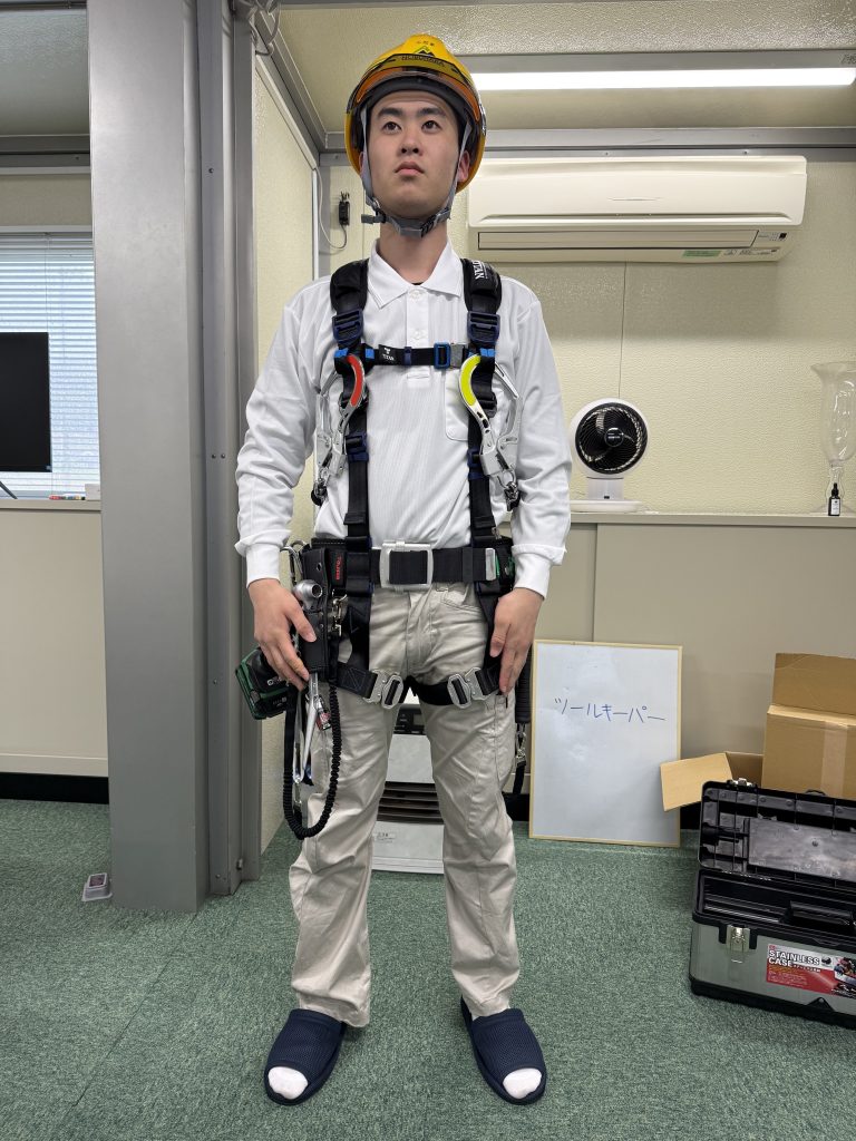 続いて、フルハーネス型安全帯を装着していきます。